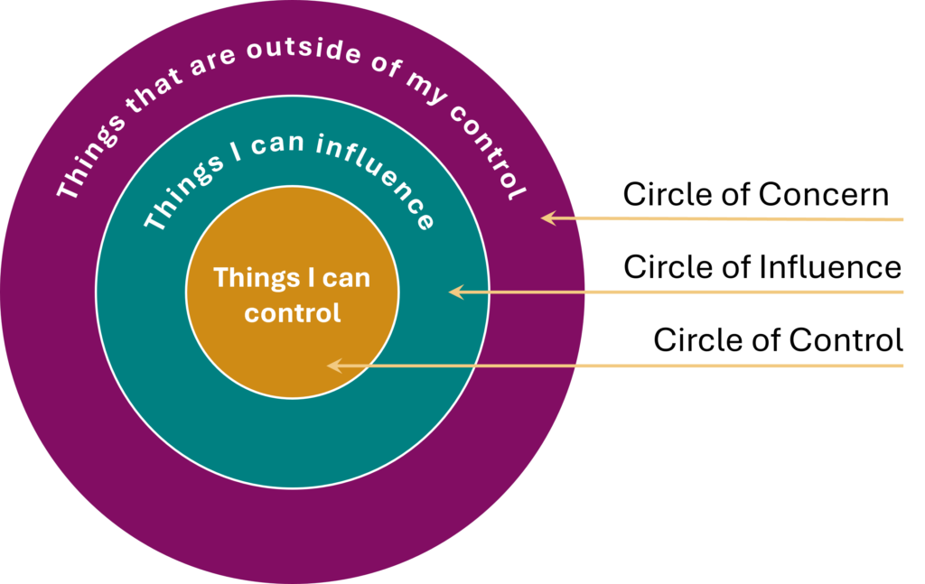 Lately, I have been reminding quite a few clients of a tool, the Circle of Influence, popularized nearly 40 years ago by Stephen Covey. In this simple model, we consider the things that are worrisome, frustrating, or confounding, and place them in one of three concentric circles. The outer circle represents things we have no influence over, but that might impact us: decisions and choices made without our input and held steadfastly. One way of thinking about these items is that they are things we can worry about but can’t do anything about. The middle circle represents the things over which we have no direct decision-making authority but can still influence. We might have expert input, a vote, or an opportunity to persuade. The inner circle (perhaps the smallest on the diagram for a reason) contains those things we do, in fact, control, and thus can autonomously choose, change, or direct.
